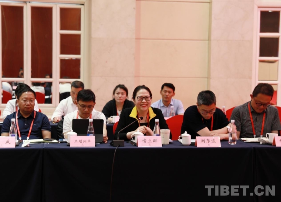 圖為全國政協(xié)委員、西藏自治區(qū)工商聯(lián)副主席、西藏青年企業(yè)家商會會長、西藏眾源建材集團有限公司董事長卓嘎(前排左三)發(fā)言 攝影:劉莉