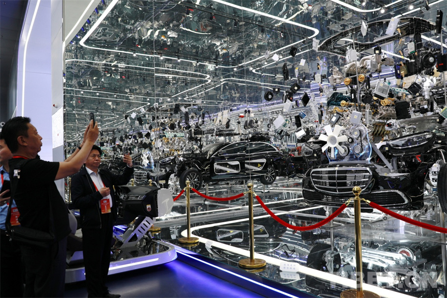 圖為西藏自治區(qū)工商聯(lián)民營企業(yè)家赴京學(xué)習(xí)參觀團一行在北方國際汽車教育拍攝奔馳整車吊裝爆炸式工業(yè)藝術(shù)展示 攝影:劉莉