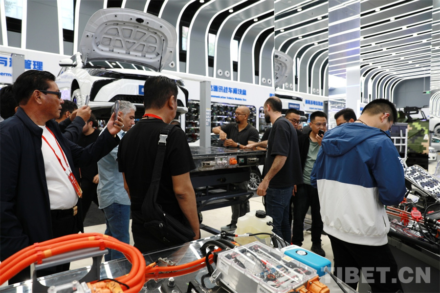 “這是由7104節(jié)電池組成的特斯拉的電池組,它是402伏的高壓電。所以,沒有經(jīng)過專業(yè)培訓(xùn)進行電動汽車維修會有一定的危險性?!北狈絿H汽車教育展廳、車間負責(zé)人黨超為到訪的西藏自治區(qū)工商聯(lián)民營企業(yè)家赴京學(xué)習(xí)參觀團一行詳細介紹著墻上展示的電池組。大家聽得津津有味。