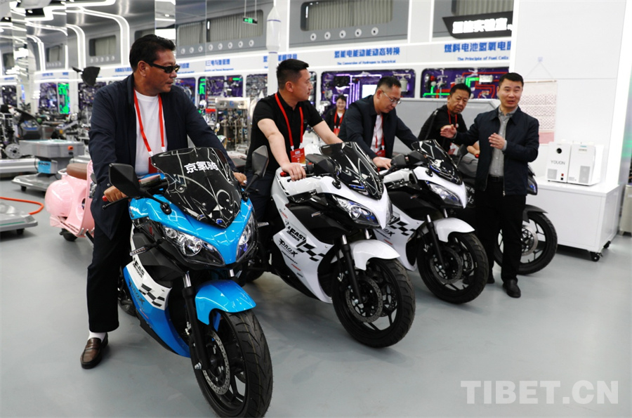 圖為西藏自治區(qū)工商聯(lián)民營企業(yè)家赴京學(xué)習(xí)參觀團一行體驗氫能摩托車 攝影:劉莉