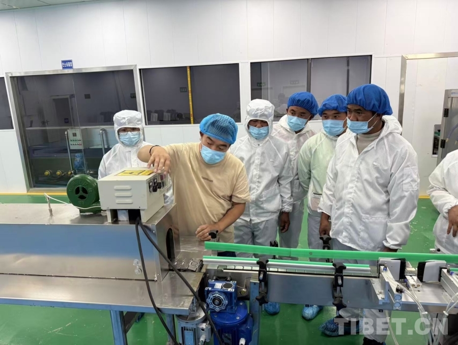 圖為生產(chǎn)車間里,巴桑旦增正專注調(diào)試設(shè)備,身旁同事們認(rèn)真觀摩學(xué)習(xí)