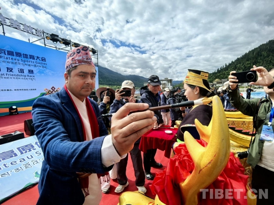 6月15日,14支國內(nèi)外隊伍參加2025年西藏林芝南迦巴瓦高原體育大會——中尼高原龍舟友誼賽。圖為尼泊爾代表為龍點睛 攝影:王淑