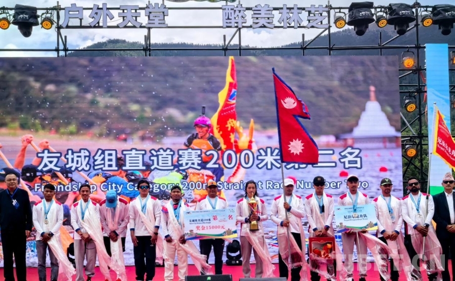 6月15日,14支國內(nèi)外隊伍參加2025年西藏林芝南迦巴瓦高原體育大會——中尼高原龍舟友誼賽。圖為尼泊爾隊獲得友城組直道賽200米第二名 攝影:王淑