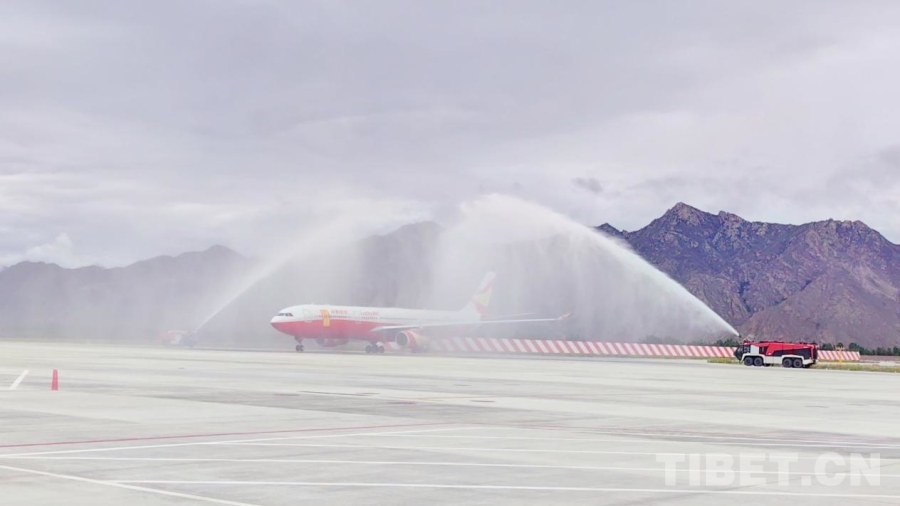 圖為8L9669航班在拉薩貢嘎國(guó)際機(jī)場(chǎng)穿過(guò)“水門(mén)”
