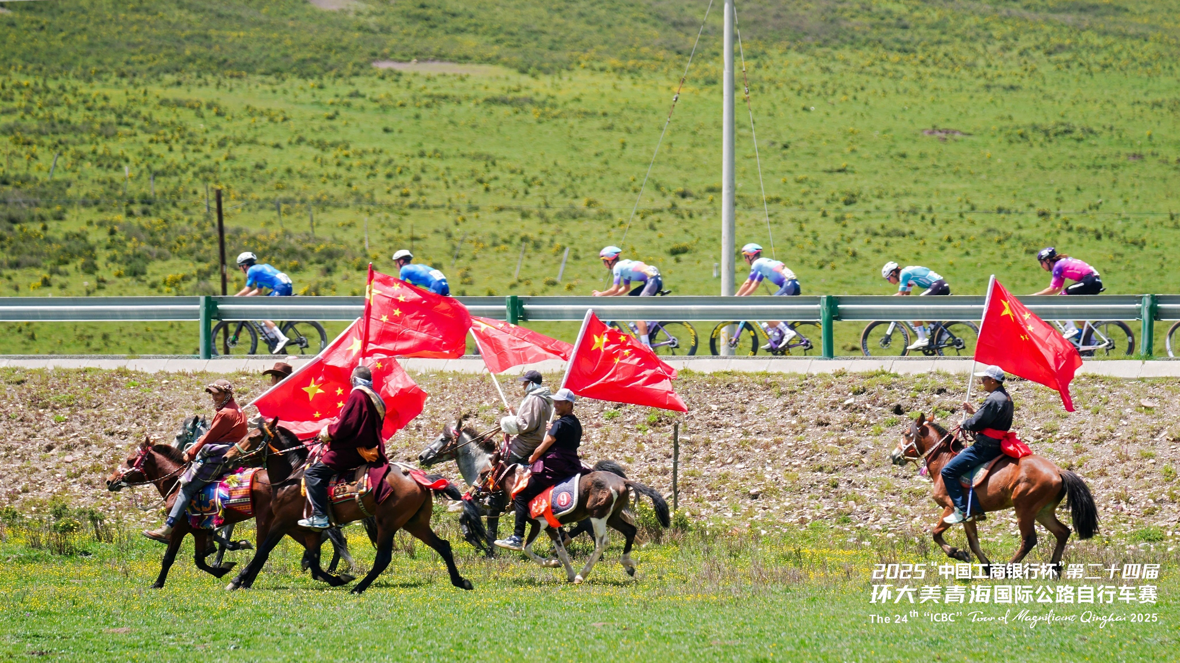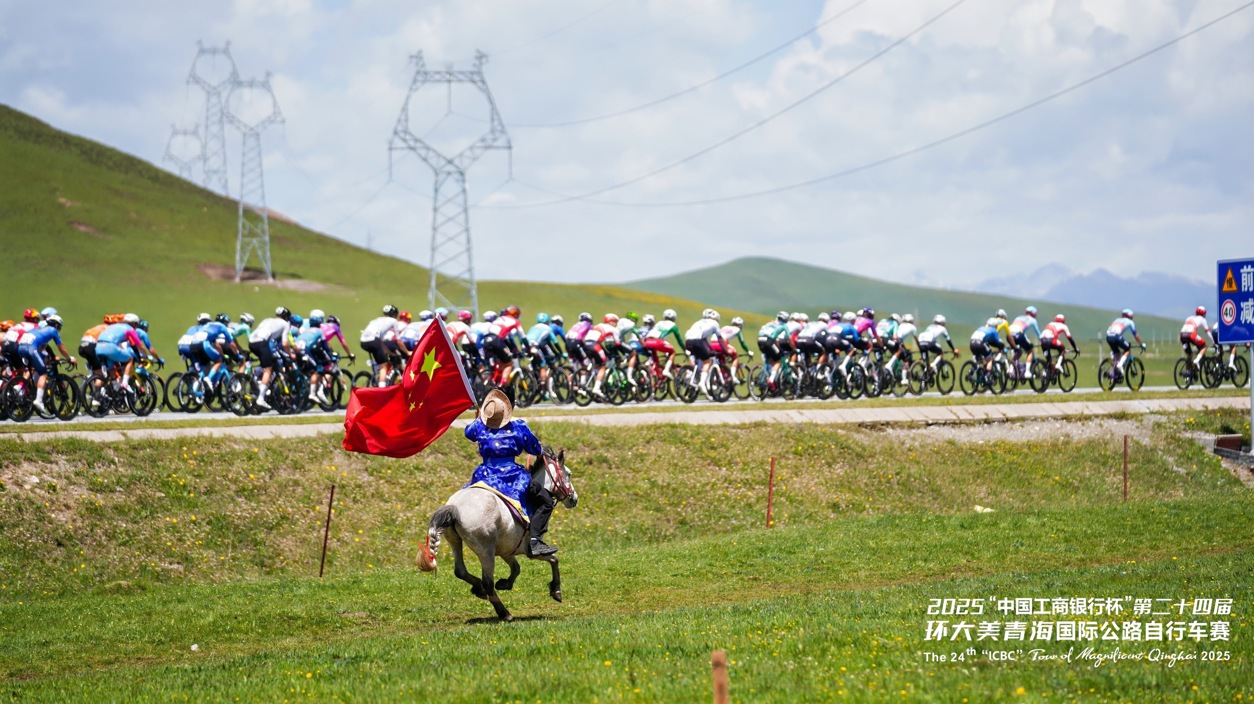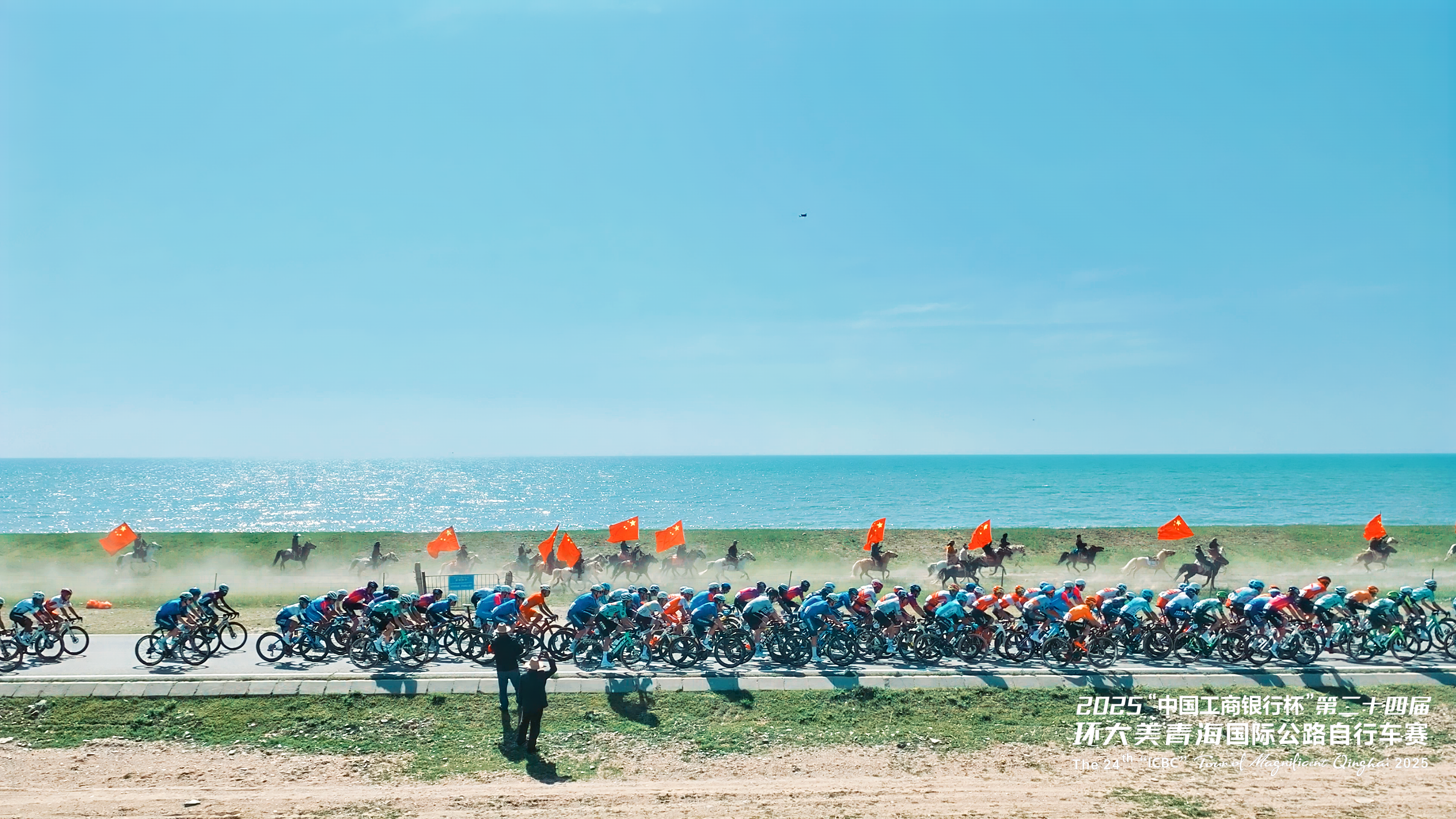 在青海湖畔,牧民們手擎國(guó)旗策馬飛馳,與選手們并肩競(jìng)逐。這一場(chǎng)景也致敬了全球頂尖自行車(chē)賽事環(huán)法自行車(chē)賽中自行車(chē)與馬匹同行的經(jīng)典畫(huà)面——騎馬承載著人類悠久的出行記憶,自行車(chē)則象征著現(xiàn)代的綠色出行理念,此刻,在青海湖畔,傳統(tǒng)與現(xiàn)代完美交融,共同譜寫(xiě)著人與自然和諧共處的動(dòng)人篇章。
