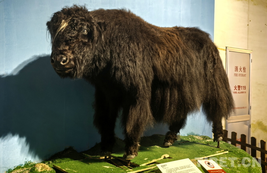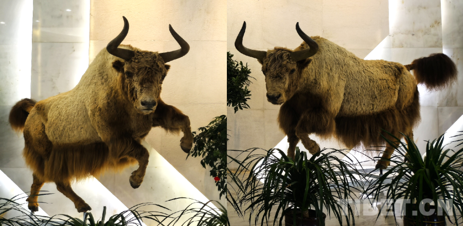 圖為西藏牦牛博物館大廳里陳列的兩頭巨大的金絲野牦牛標本。圖左的約16-17歲,體型較大;圖右的接近20歲,體型較小 攝影:劉莉