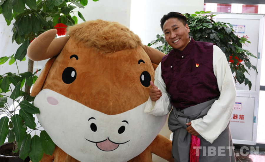 圖為西藏牦牛博物館藏品管理研究部負責人西熱與該館以金絲野牦牛形象創(chuàng)作的吉祥物之一合影 攝影:劉莉