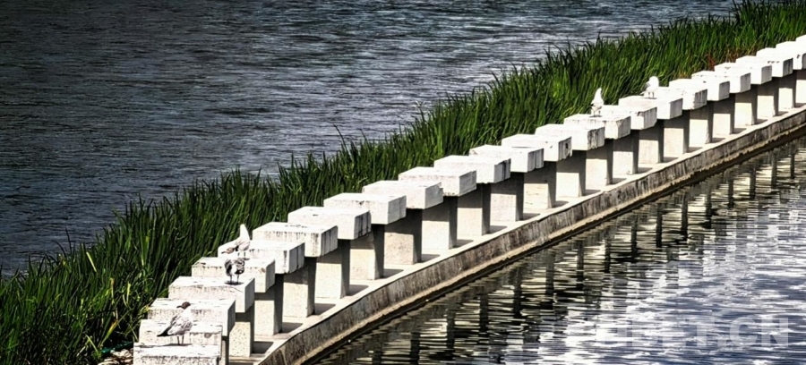 圖為拉薩兩島內(nèi)河綠色生態(tài)廊道一隅,水鳥棲息在河中的堤壩上 攝影:劉莉