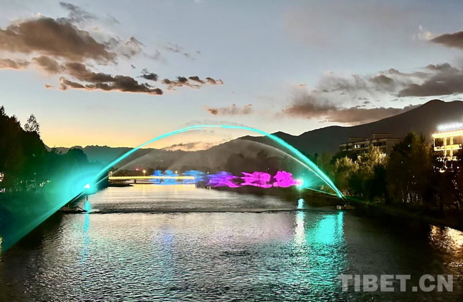 圖為拉薩兩島內(nèi)河綠色生態(tài)廊道提升工程新建的水幕電影在傍晚時分亮起 拉薩市水利局供圖