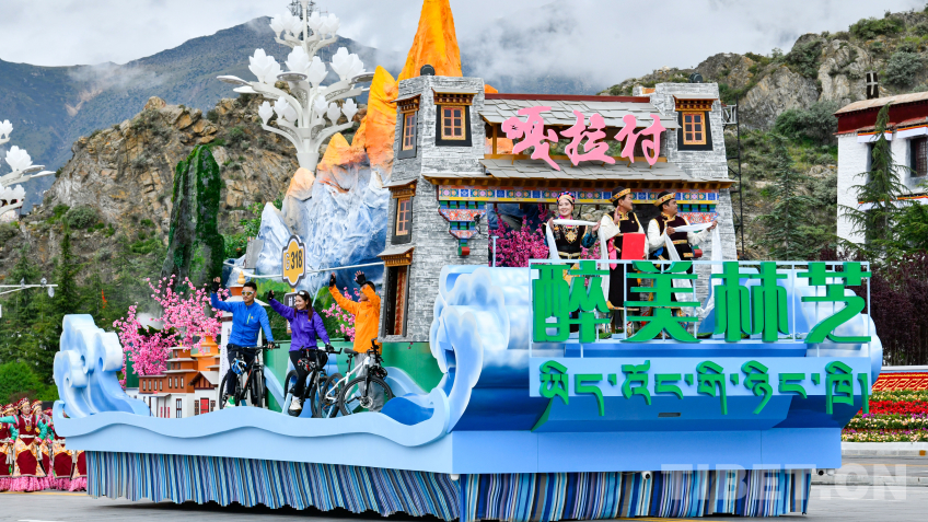 林芝市彩車,以雅魯藏布江造型托起林芝嘎拉村大門,村黨支部書記手捧習(xí)近平總書記的重要回信,表達(dá)了高原兒女對黨和國家的感恩、對習(xí)近平總書記的愛戴。