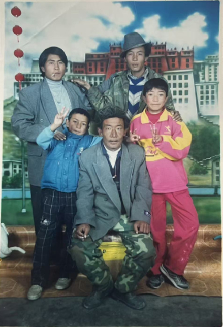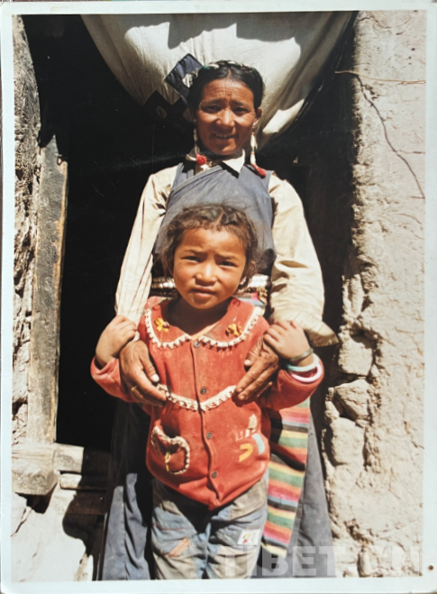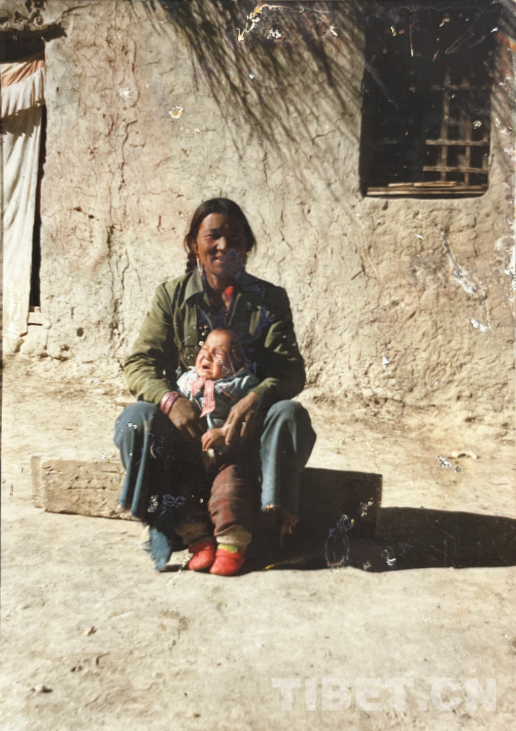 這是在我們家老房子門口照的。那時候全是土坯房,這間是四間房里最大的。大概是1990年左右。記得穿的這身衣服那些年很多人都穿,應(yīng)該是軍裝,穿著這衣服騎馬去挖藥很多次。人民公社時期我們有八個生產(chǎn)隊,那時候要采藥掙工分,偶爾拉薩藏醫(yī)院的老師們會專程來札達,我們也要幫忙去采藥。這邊藥材很多,如雪蓮花、黃連、蒂丁等。拍這張照片時孩子的鞋和幾件衣服是我自己織的,但要買好衣服還得去阿里地區(qū)。那時我丈夫已經(jīng)在開車,我們家條件稍好些,但也不是村里最好的。