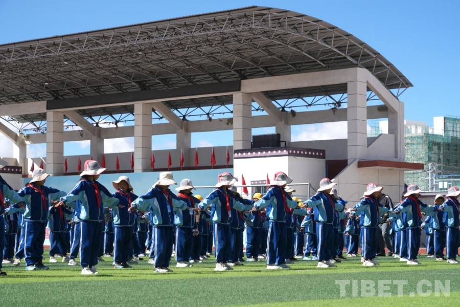 圖為在西藏阿里陜西實(shí)驗(yàn)學(xué)校操場(chǎng),孩子們列隊(duì)做操 攝影:邊子捷