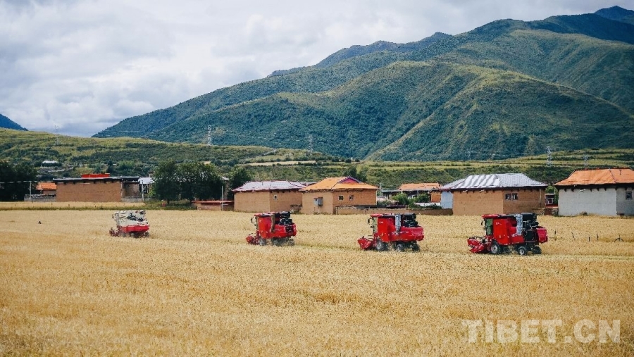 圖為機械化青稞收割現(xiàn)場