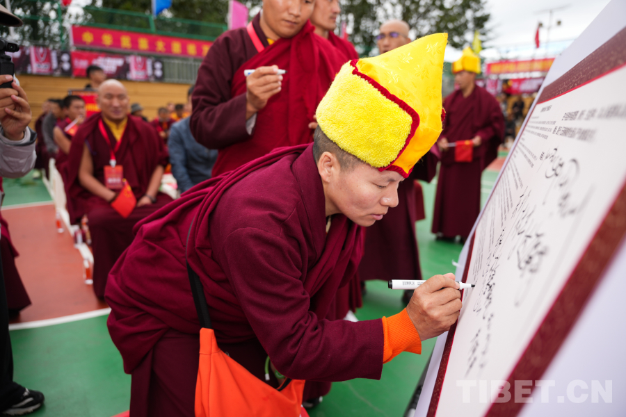圖為開幕式上,全州藏傳佛教界代表人士在《云南省佛教界全面從嚴治教倡議書》上簽字 噶丹·松贊林寺供圖