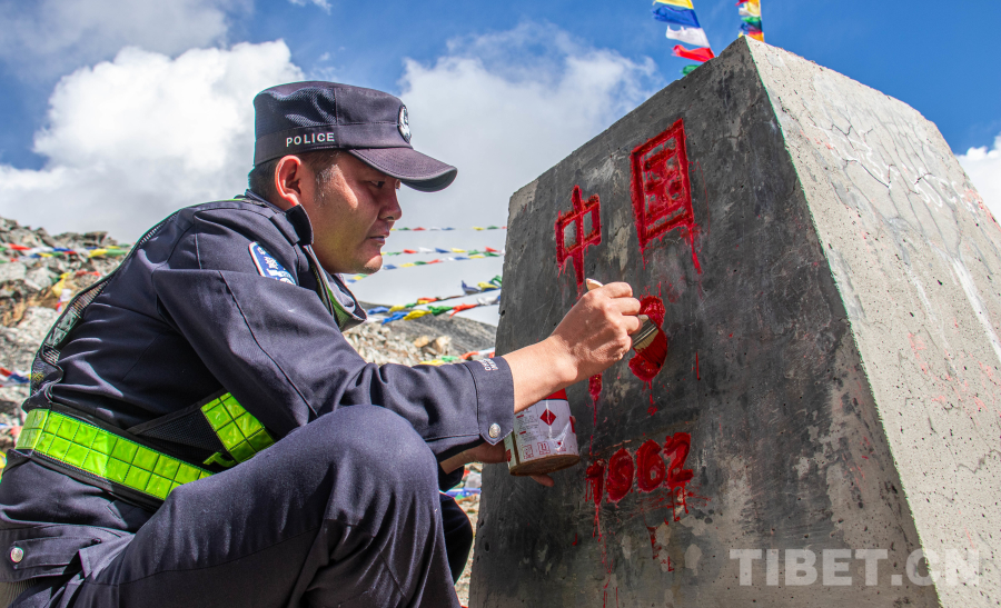 圖為日喀則邊境管理支隊(duì)霍爾巴邊境派出所民警為紀(jì)念中國人民抗日戰(zhàn)爭暨世界反法西斯戰(zhàn)爭勝利80周年開展界碑描紅 攝影:楊承旭