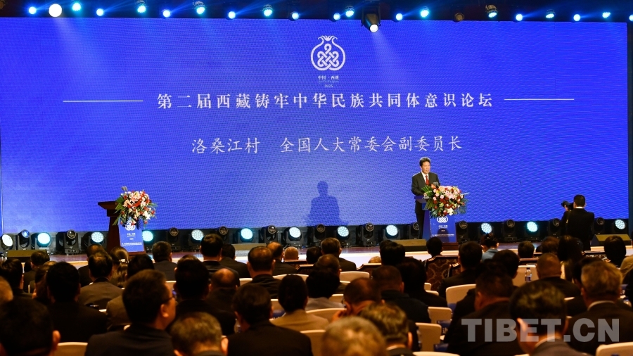 圖為全國(guó)人大常委會(huì)副委員長(zhǎng)洛桑江村在第二屆西藏鑄牢中華民族共同體意識(shí)論壇上致辭 攝影:趙振宇