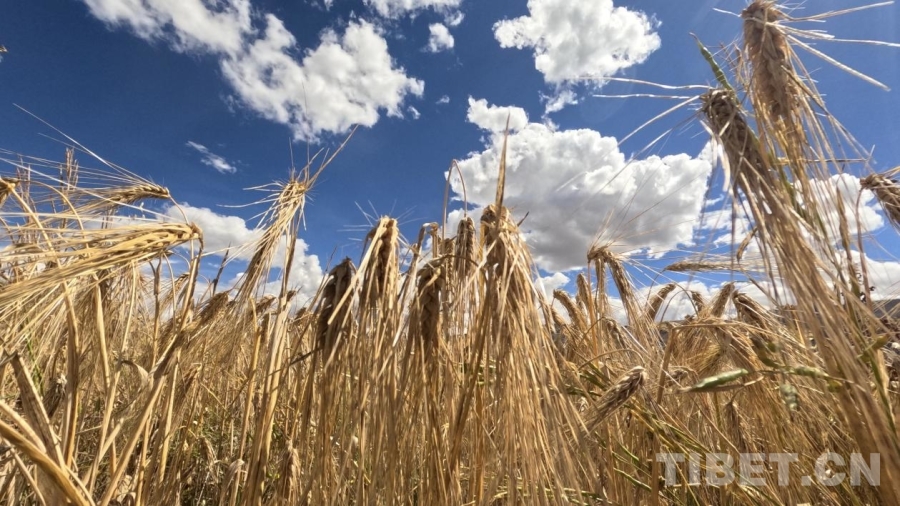 圖為藍(lán)天白云之下飽滿的青稞迎來成熟 攝影:德吉卓瑪