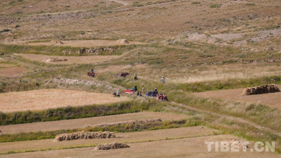 圖為聯(lián)合收割機(jī)工作現(xiàn)場 攝影:德吉卓瑪