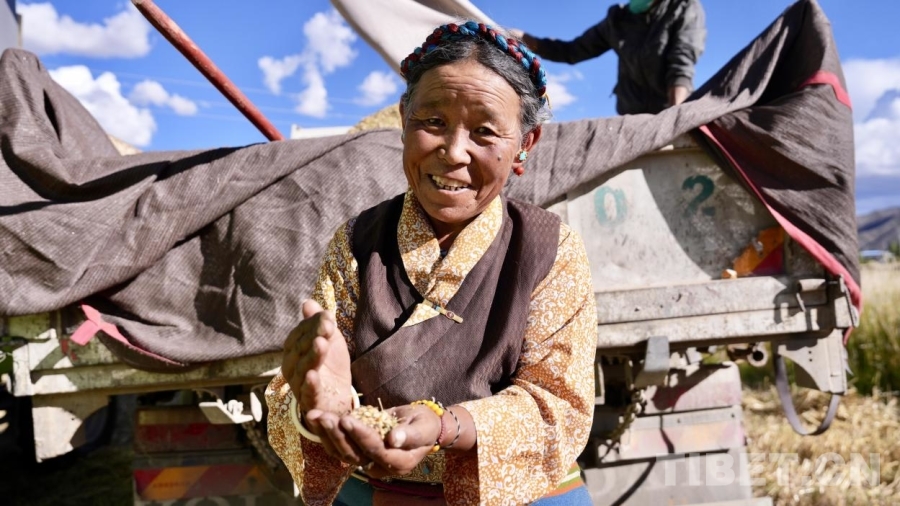 圖為阿媽格桑手捧剛剛剝皮脫粒的青稞 攝影:德吉卓瑪