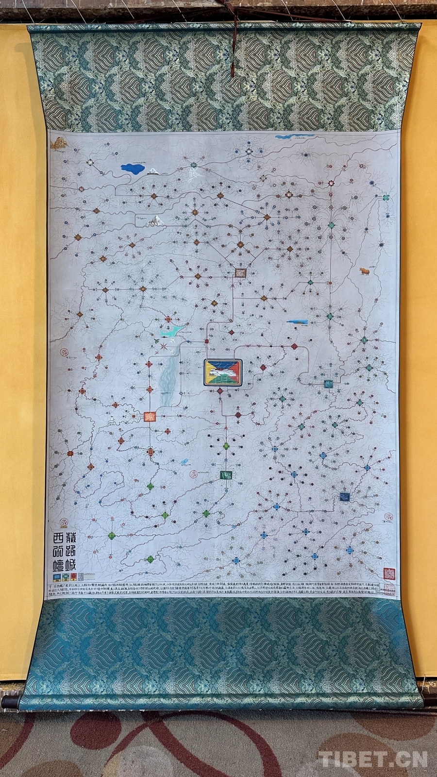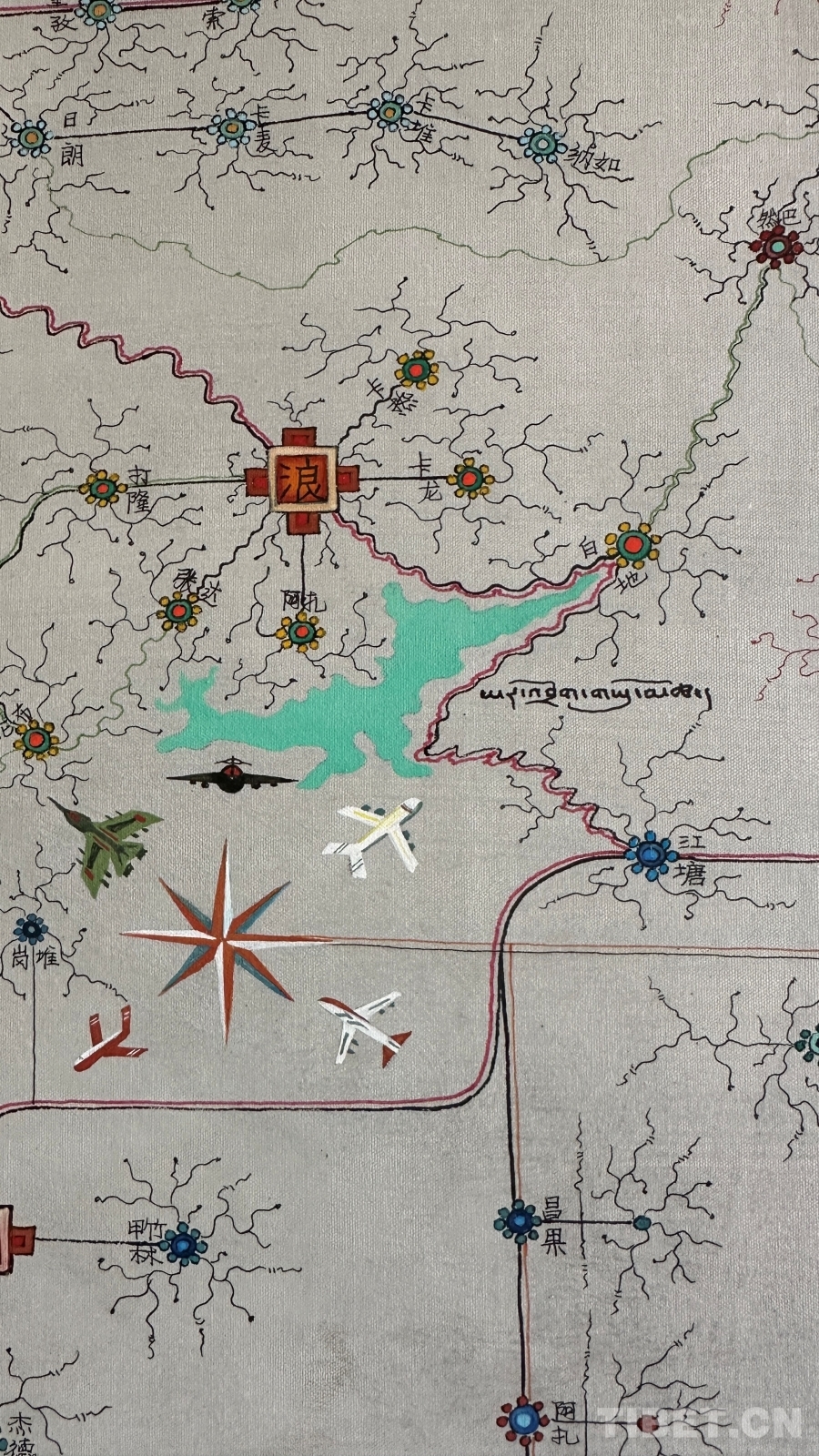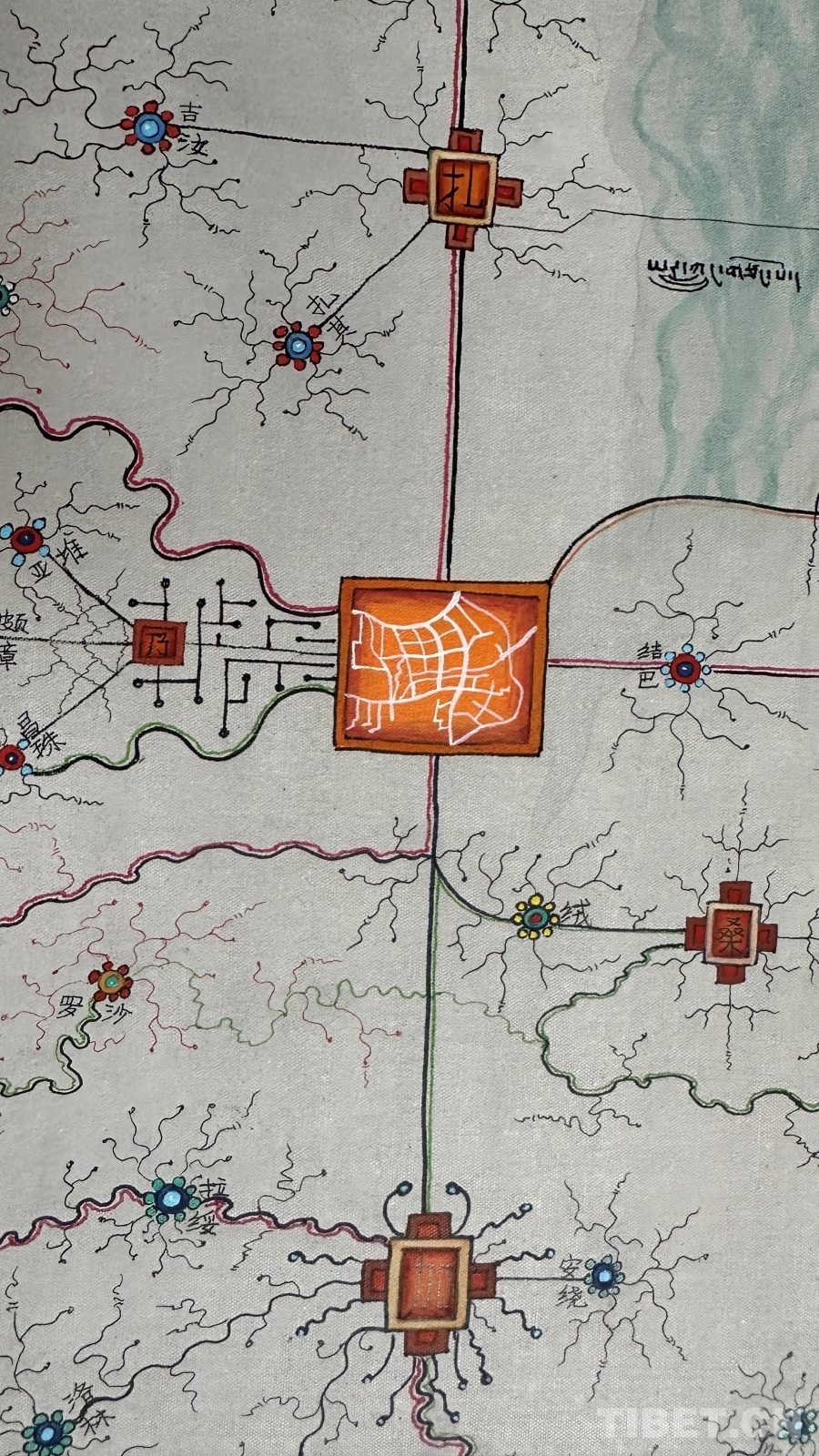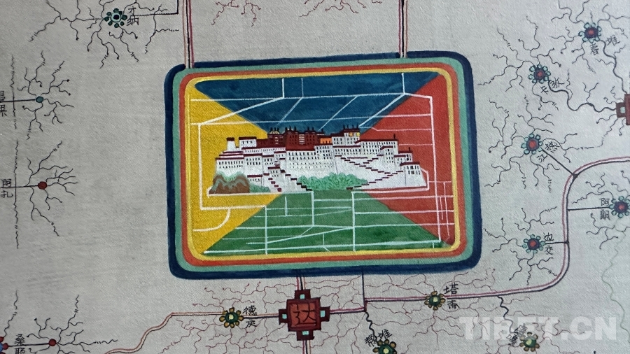 達(dá)布詳細(xì)解釋了這幅唐卡的圖像系統(tǒng):正方形代表市、區(qū),內(nèi)部畫有該市區(qū)主干道地圖;十字方形代表縣;圓形寶石形代表鄉(xiāng)鎮(zhèn);藏文“嗡”字代表名勝古跡;此唐卡以黑線為所有公路基礎(chǔ)線,黑線邊上的紅黃線代表國道和高速,綠線代表省道,黑細(xì)線代表縣鄉(xiāng)鎮(zhèn)及村級公路。沿途還繪制了珠峰、古格王國遺址、納木錯(cuò)等代表性景點(diǎn),并用藏文標(biāo)注名稱。