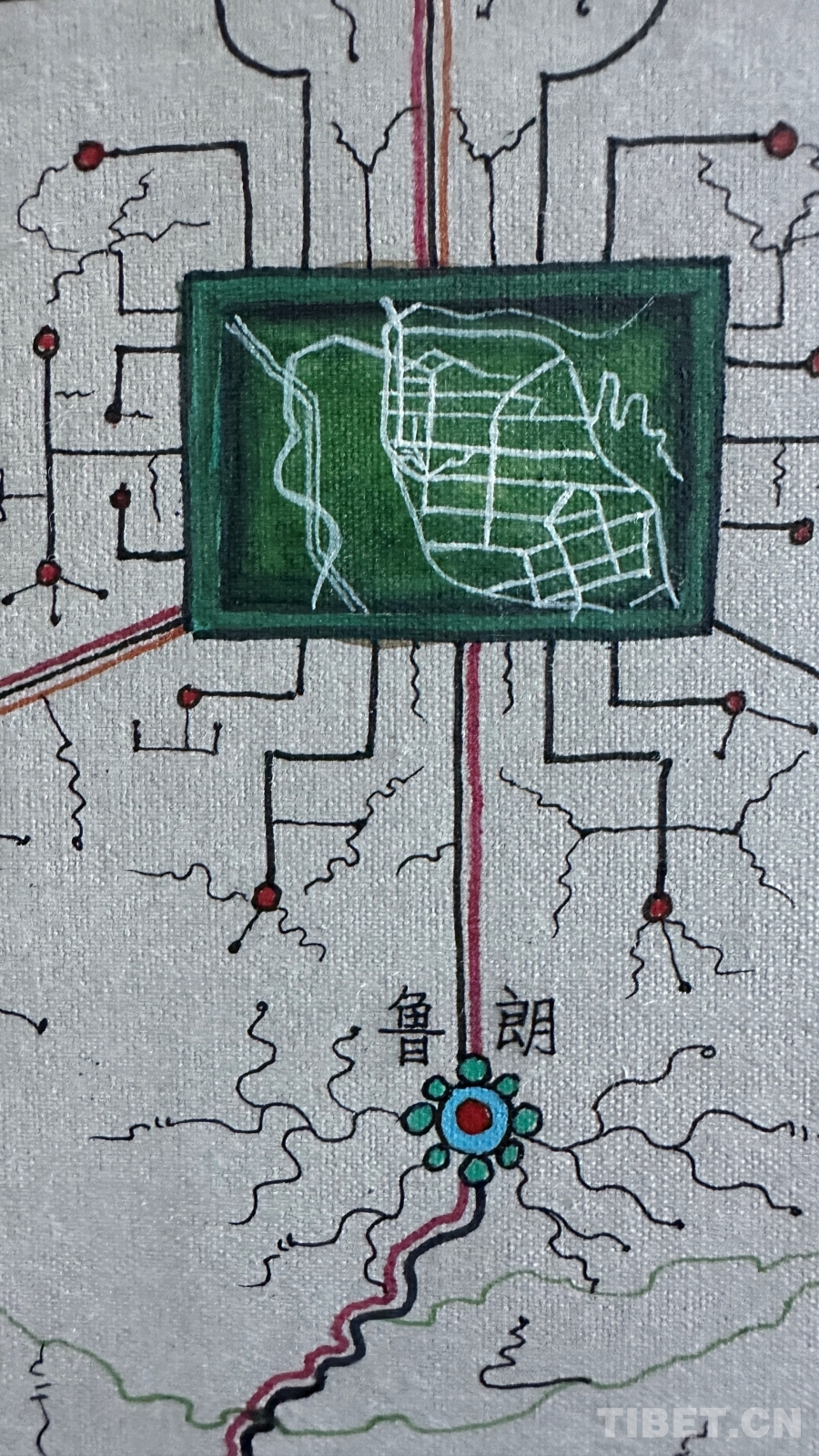 創(chuàng)作過程中最大的困難是如何藝術(shù)地表現(xiàn)公路網(wǎng)絡(luò)?!拔彝ㄟ^分析現(xiàn)代地圖、衛(wèi)星導(dǎo)航、古代寶藏圖和手繪地圖,發(fā)現(xiàn)西藏公路是順應(yīng)地貌修建的?!边_(dá)布描述著他的發(fā)現(xiàn),“沿著河流,一條河有幾個(gè)分支就有幾條路;沿著山谷,一個(gè)大山谷有幾個(gè)小山溝就有幾條路。俯看就像一棵大樹,又像是電腦芯片,一條主干道邊上分出無數(shù)支線?!?nbsp;