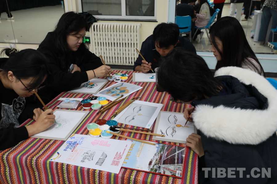 圖為同學(xué)們在活動現(xiàn)場體驗傳統(tǒng)唐卡繪畫。攝影:畢然
