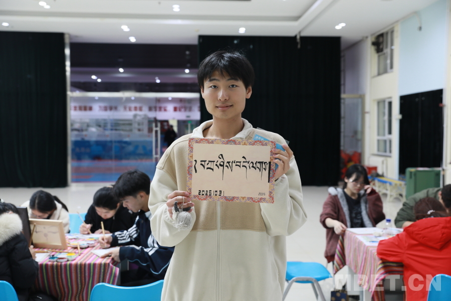 圖為2024級公共管理專業(yè)的楊乘鶴同學(xué)展示他在藏文書法體驗環(huán)節(jié)創(chuàng)作的作品。攝影:畢然