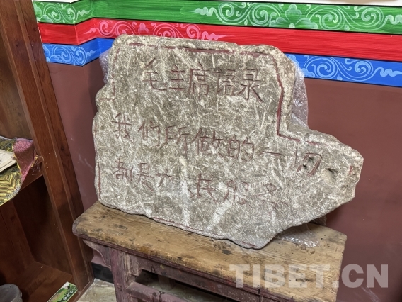 如今,松安寺內(nèi)有一座專門設(shè)立的紅色文物陳列室,長青介紹道,這座紅色文物陳列室是現(xiàn)任活佛羅讓甲央在當(dāng)?shù)卣С窒禄I建而成。陳列室廣泛收集了有關(guān)紅色文物進(jìn)行集中展示,供僧眾和信教群眾參觀學(xué)習(xí)。有一塊石刻被視為“鎮(zhèn)館之寶”,上面刻著毛主席的語錄“我們所做的一切都是為人民服務(wù)”。石刻是寺廟在維修僧房時從房基下發(fā)現(xiàn)而挖出的,年代久遠(yuǎn),也見證了歷史里精神的傳承。