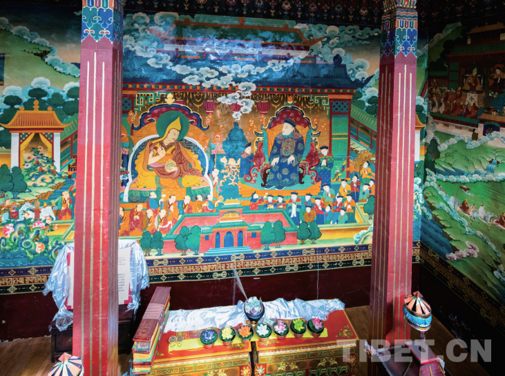 圖為五世達賴?yán)锕示觾?nèi)的壁畫——清順治皇帝接見五世達賴?yán)?/p>
