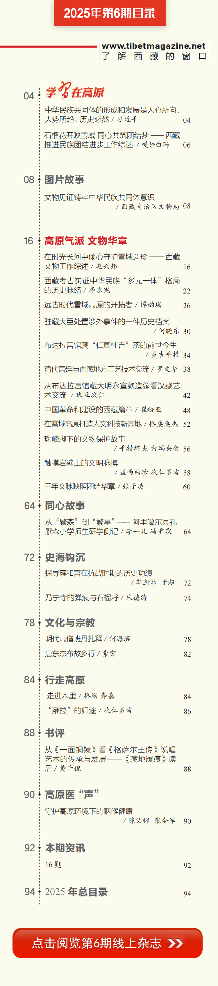 歲聿云暮,秋收冬藏?!吨袊?guó)西藏》漢文版2025年第6期如期與讀者見面了,本期雜志是西藏文物??玫搅宋鞑刈灾螀^(qū)文物局、故宮博物院的大力支持,集納了有關(guān)文稿13篇、圖片90余幅,從文物考古角度追溯各民族交往交流交融的歷史,展現(xiàn)青藏高原文明崛起與民族融合的壯麗詩篇。