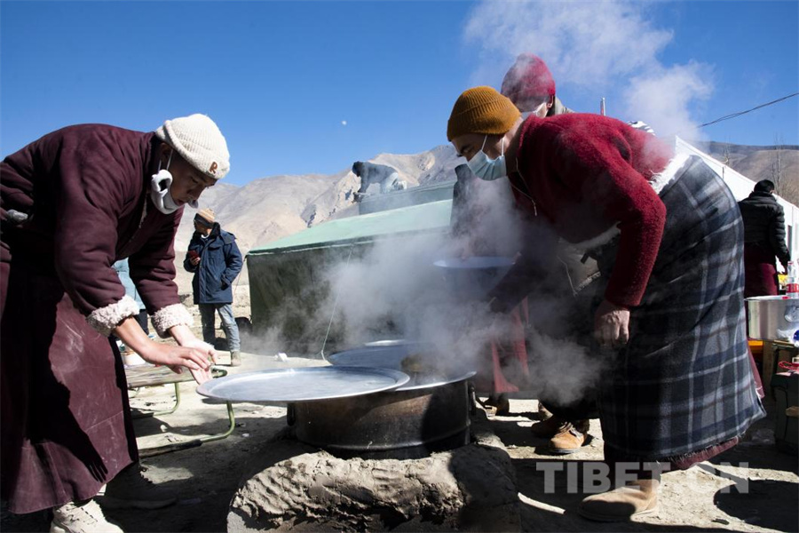 圖為在定日縣長所鄉(xiāng)古榮村安置點內(nèi),解放軍官兵為受災群眾提供一日三餐(攝于2025年1月11日) 攝影:趙振宇