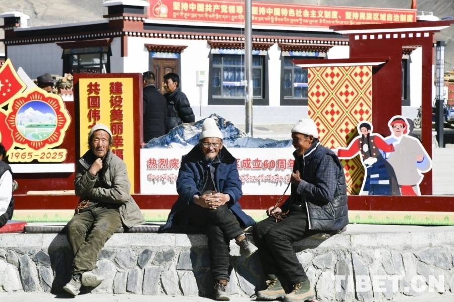 圖為定日縣長所鄉(xiāng)森嘎村老人在村中廣場沐浴陽光,快樂交談。攝影:趙振宇
