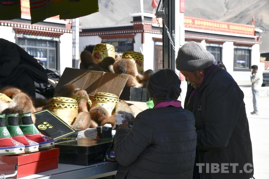 圖為日喀則農(nóng)事新年即將來臨,定日縣長所鄉(xiāng)森嘎村老人在集市上挑選新裝。攝影:趙振宇