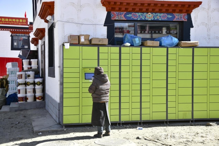 圖為定日縣長所鄉(xiāng)森嘎村村民在自動快遞柜前收取快遞。攝影:趙振宇