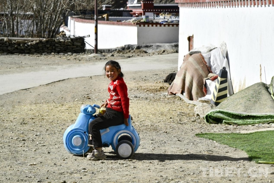 圖為定日縣長所鄉(xiāng)古榮村內(nèi)在自家新居前快樂玩耍的小女孩。攝影:趙振宇