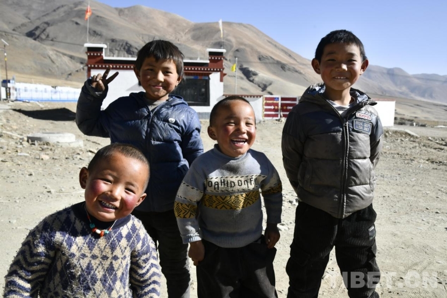 圖為定日縣長所鄉(xiāng)古榮村的小朋友們在新居前快樂合影。攝影:趙振宇