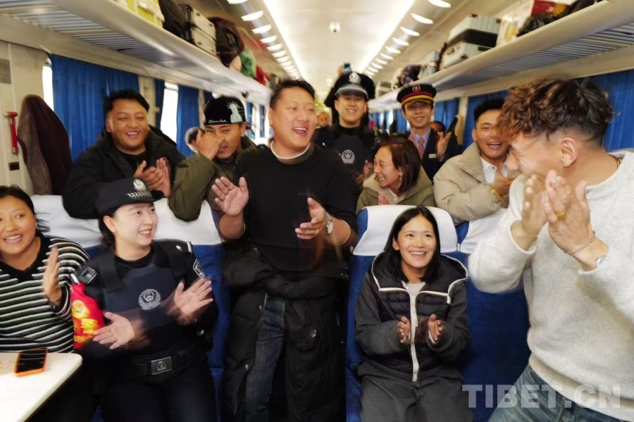 圖為列車車廂內(nèi),乘警與返鄉(xiāng)學(xué)子載歌載舞,悠揚(yáng)的歌聲在“天路”之上回蕩,讓返鄉(xiāng)歸途暖意融融