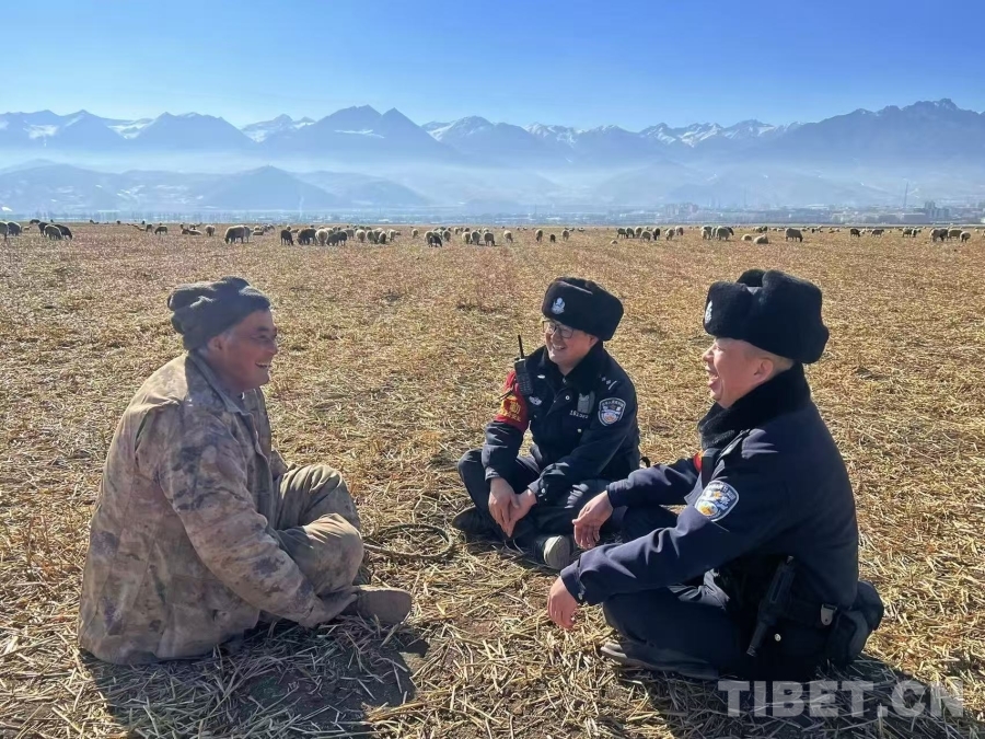 圖為祁連山腳下門源車站,青藏鐵警向當(dāng)?shù)厝罕娒鎸?duì)面宣講鐵路安全知識(shí),共筑平安防線