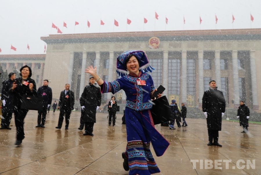 3月4日上午,十四屆全國(guó)人大四次會(huì)議舉行預(yù)備會(huì)議。會(huì)后,一場(chǎng)春雪不期而至。走出會(huì)場(chǎng)的全國(guó)人大代表、廣西金秀瑤族自治縣桐木中學(xué)副校長(zhǎng)梁麗斌向記者們揮手致意。