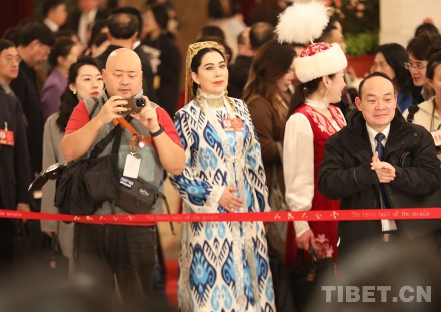 3月5日上午,首場(chǎng)“代表通道”集中采訪活動(dòng)在人民大會(huì)堂舉行。全國(guó)人大代表、新疆維吾爾自治區(qū)少數(shù)民族古籍保護(hù)研究中心副編審米娜瓦爾·艾比布拉(前排左二)旁聽(tīng)代表發(fā)言。