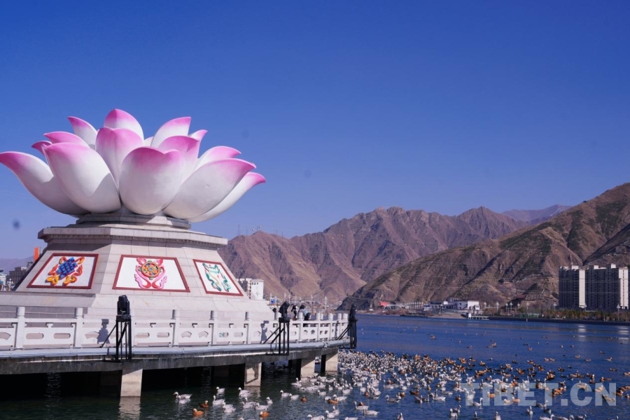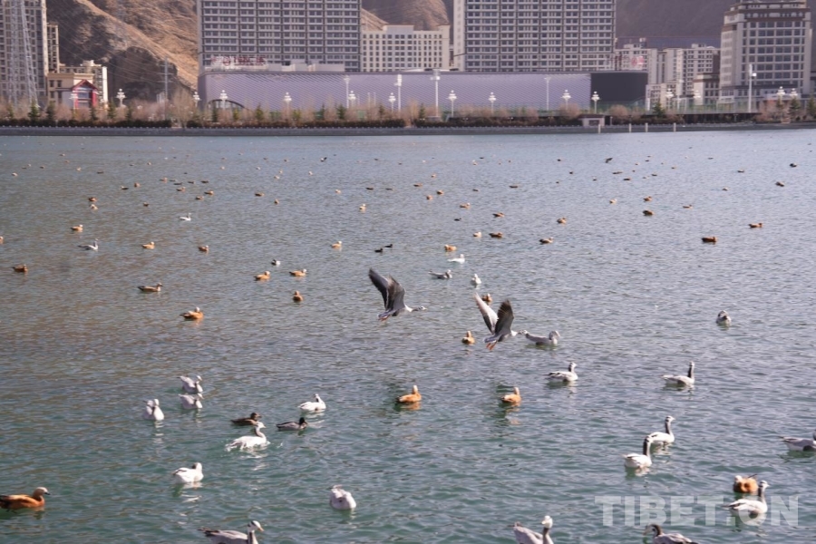 現(xiàn)代化的城市樓宇與連綿的群山相依,成群的斑頭雁、赤麻鴨在拉薩河中游弋,勾勒出人與自然和諧共生的高原圖景。 攝影:張藝彤