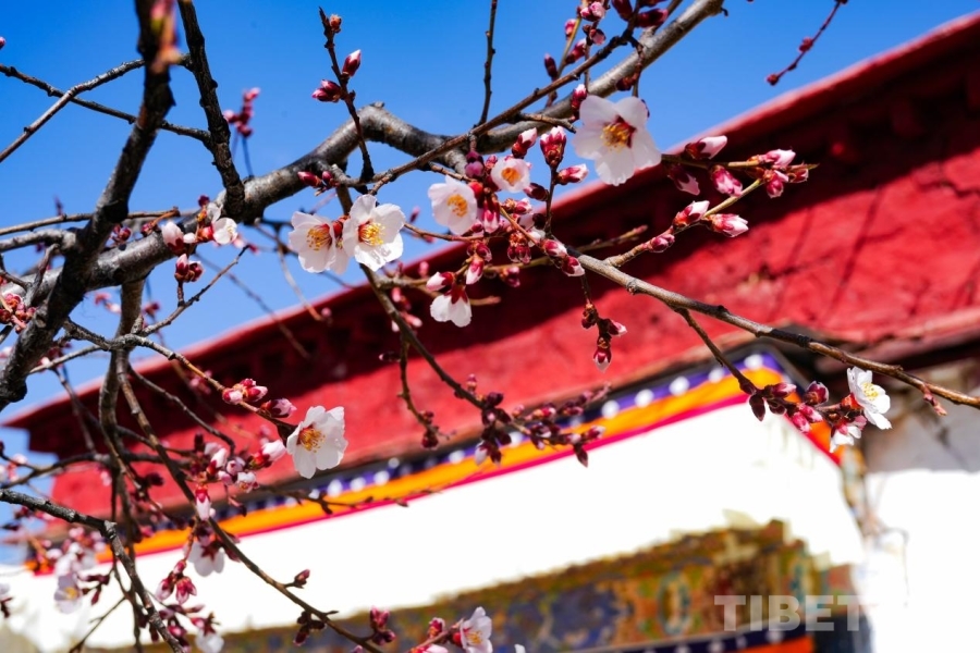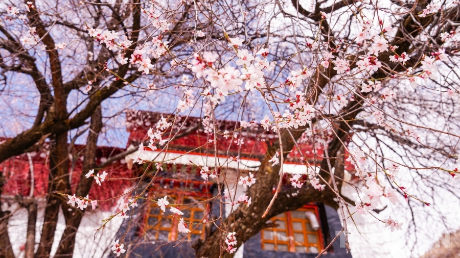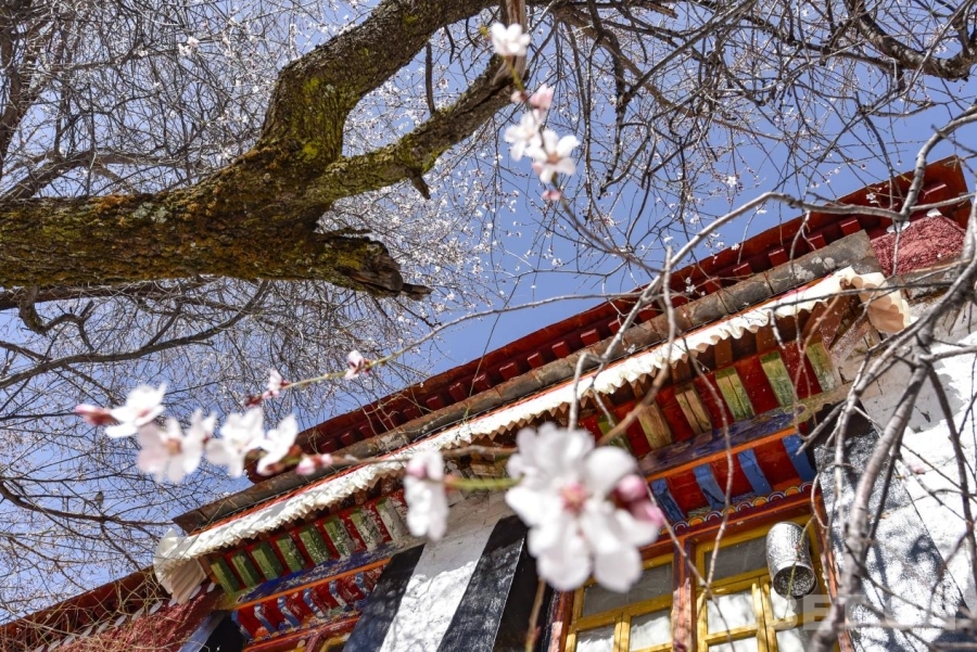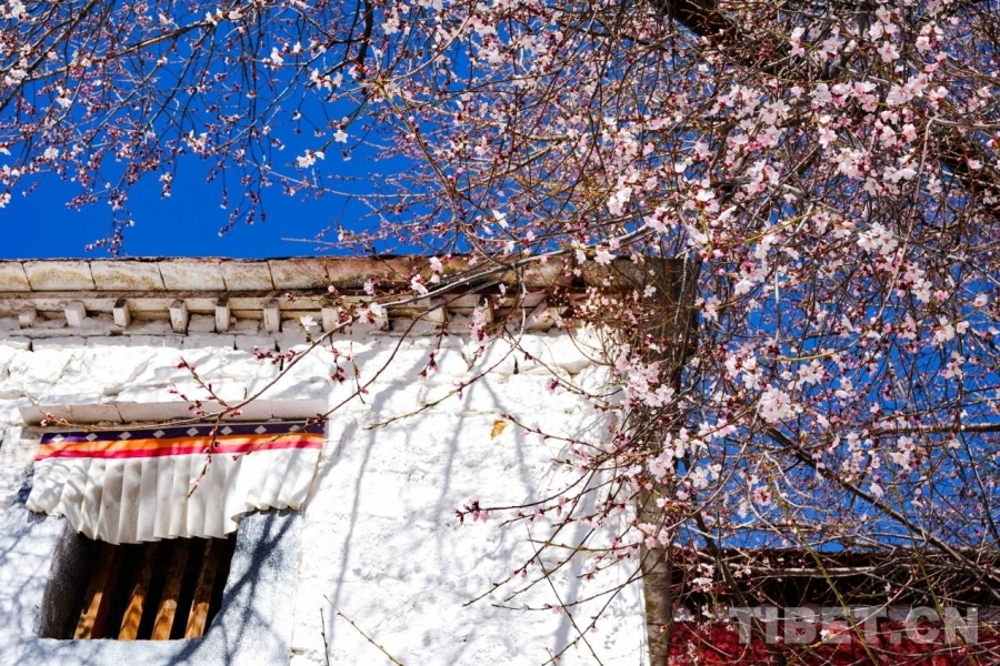 帕邦喀寺盛開的桃花,在門窗的映襯下別有一番風(fēng)景 攝影:趙振宇
