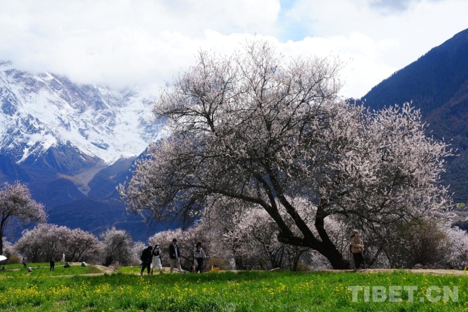 4月4日,索松村桃花樹(shù)、雪山、與游人交織的景色 攝影:張藝彤