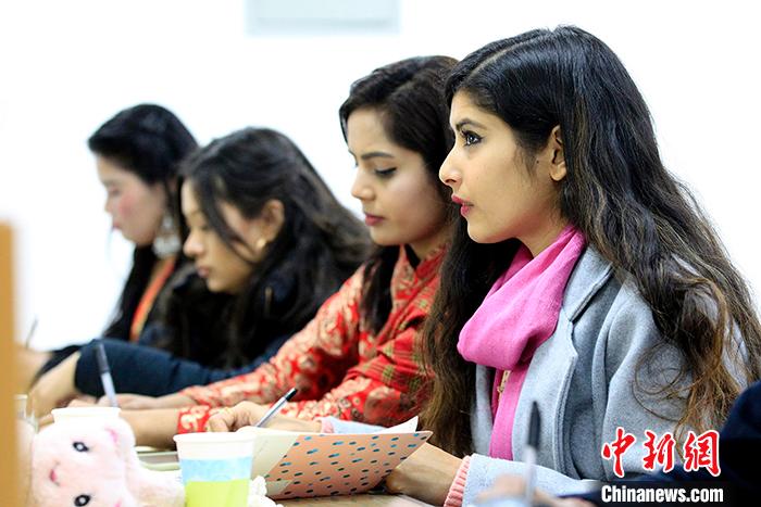 1月8日,西寧,設立在的青海大學藏醫(yī)學院的藏醫(yī)藥國際合作基地(青海)里,2019年“一帶一路”尼泊爾藏醫(yī)藥短期留學生班的21名“絲路使者”,聽講神情專注。中新社記者 張?zhí)砀?攝