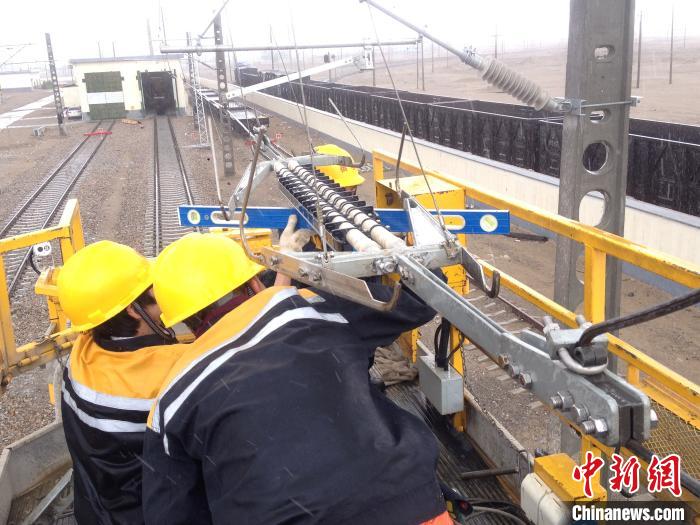 圖為中國(guó)鐵路青藏集團(tuán)有限公司西寧供電段格爾木接觸網(wǎng)大修工區(qū)的接觸網(wǎng)工對(duì)分段絕緣器進(jìn)行測(cè)量。周賀 攝