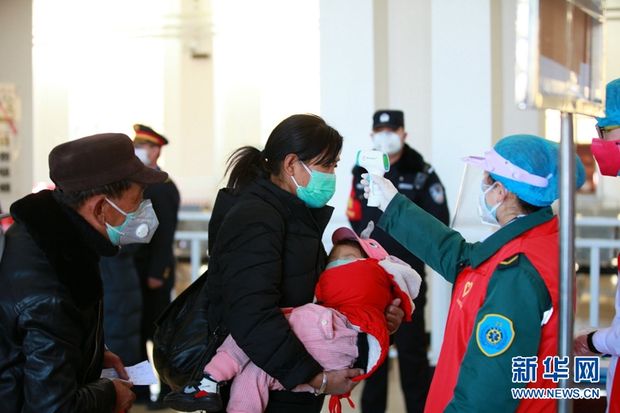 在西寧站進(jìn)站口,工作人員為每名進(jìn)站旅客進(jìn)行測量體溫。新華網(wǎng) 李俊 攝