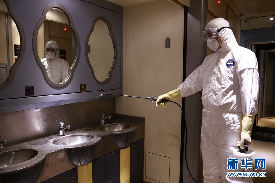 工作人員對每一列旅客列車進(jìn)行消毒作業(yè)。新華網(wǎng) 郝寶君 攝