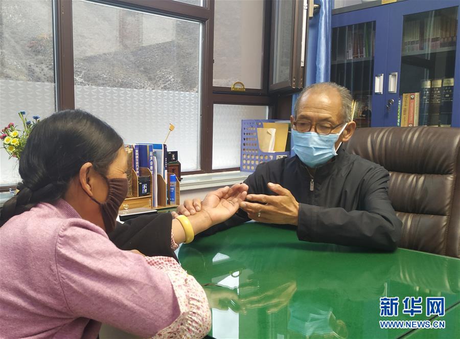 青才在位于青海省玉樹藏族自治州玉樹市仲達鄉(xiāng)電達村的藏醫(yī)診所為患者把脈(4月1日攝)。 新華社記者 王浡 攝
