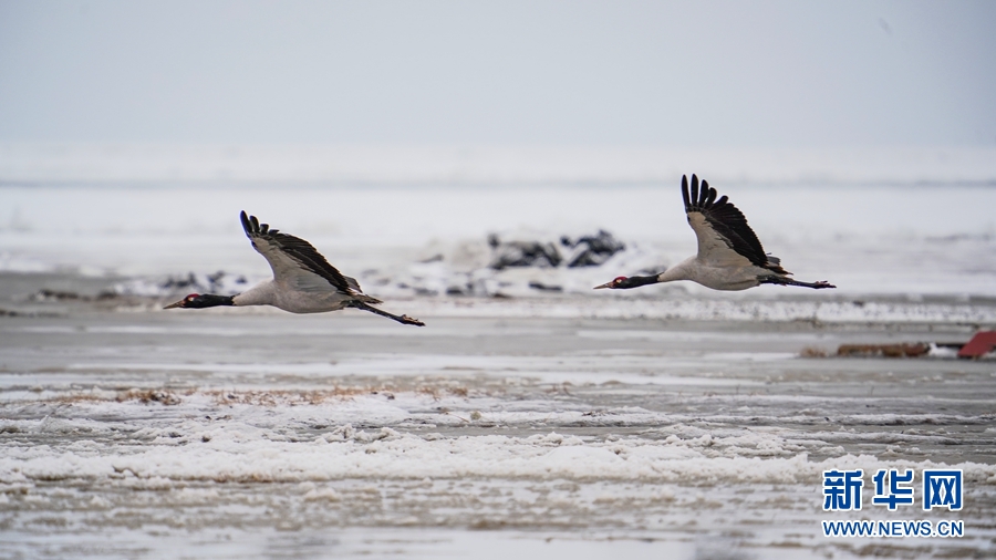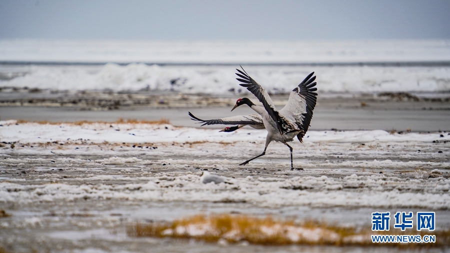 4月17日,受冷空氣影響,青海省海北藏族自治州剛察縣迎來一場春雪,兩只雪域“精靈”黑頸鶴在青海湖仙女灣景區(qū)“與雪共舞”,上演青海湖畔最美“雪中情”。
