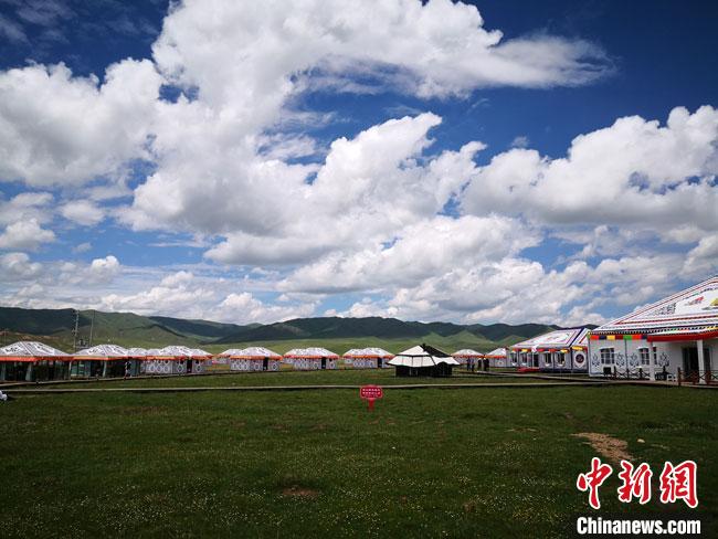 6月下旬,甘肅甘南藏族自治州碌曲縣尕海鎮(zhèn)境內(nèi)晴空萬里,湛藍(lán)的天空如同水洗過般通透明亮,輕薄如棉的云朵隨風(fēng)移動(dòng)。被一碧萬頃的草原簇?fù)碇逆匦愦澹瑵M目皆是古老藏飾風(fēng)格與現(xiàn)代時(shí)尚的交織融合,吸引絡(luò)繹不絕的游人前來體驗(yàn)“高原秘境”。